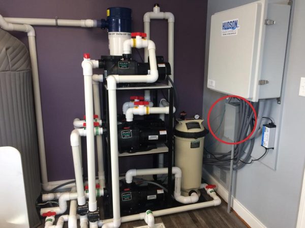 Turn the main incoming power off. The picture above shows the dark gray disconnect directly below the Hudson control cabinet. Open the disconnect from the bottom. Turn the breaker off by pushing the breaker to the left. Leave it off for a full 60 seconds. Then turn it back on by pushing the breaker to the right until you feel it click into place and hold.